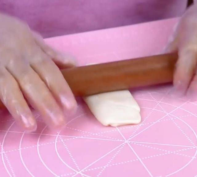 第11步、把水油皮稍微按扁,然後搟成大面片。