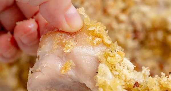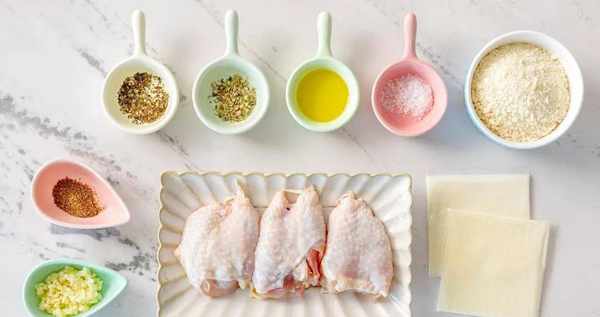 食材:雞腿肉3大塊 面包糠50g 馬蘇裡拉芝士2片 蒜末1/4勺 海鹽1/4勺