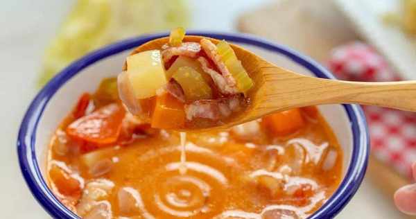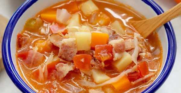 (1)將培根切成小塊,洋蔥切丁,大蒜切末,胡蘿卜切丁,芹菜切丁,土豆切丁,包心菜切絲;