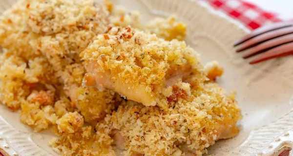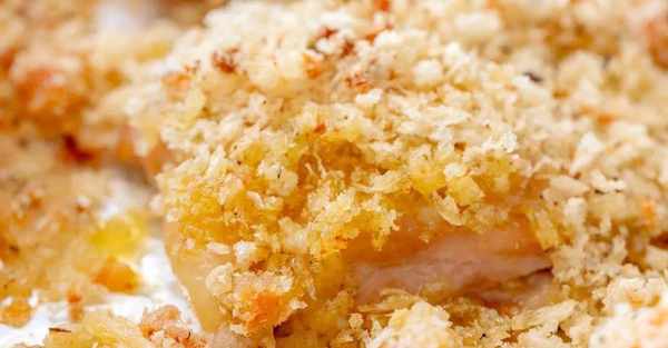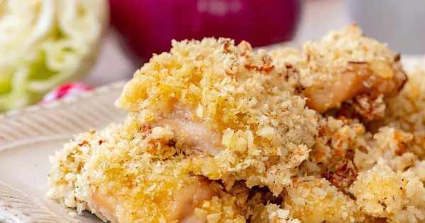 (3)雞腿肉平鋪進烤盤,再均勻地鋪上香草面包糠;