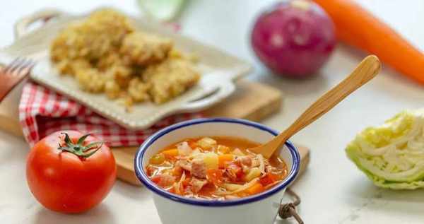 (3)之後再放入土豆、包心菜、西紅柿,煮1分鐘後,倒入提前準備好的1L雞高湯,大火煮至水沸騰之後撇去浮沫,之後轉小火再煮30分鐘就可以啦。