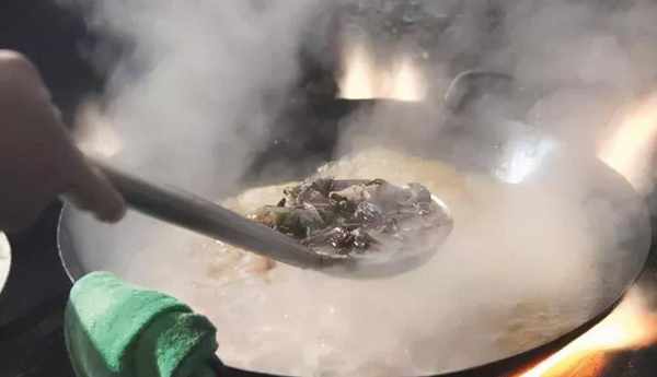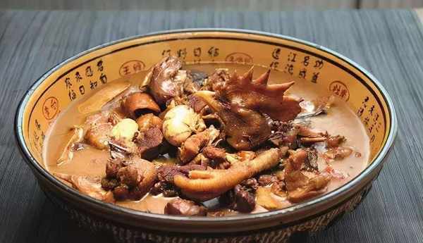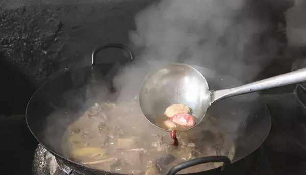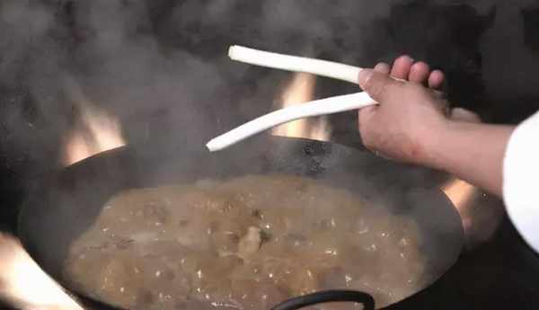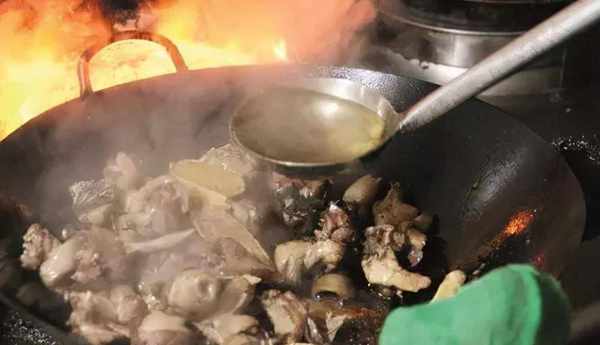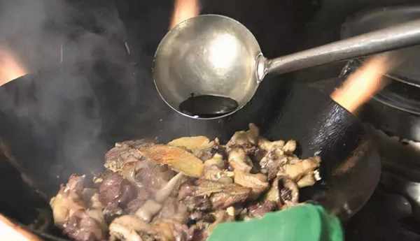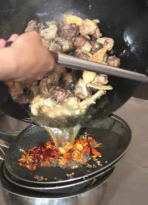 3.給高壓鍋放汽,將雞和雞湯倒回炒鍋內,去掉八角、花椒、蔥段等雜料,放入洗凈的雞腰,大火收濃汁,出鍋即可上桌。為何這道菜要叫回鍋雞呢?這是因為當食客品過一部分湯汁和雞肉後,我們再將雞和雞湯倒入鍋內,放入一些山野蔬菜略微燉制,就有更加香濃的風味。