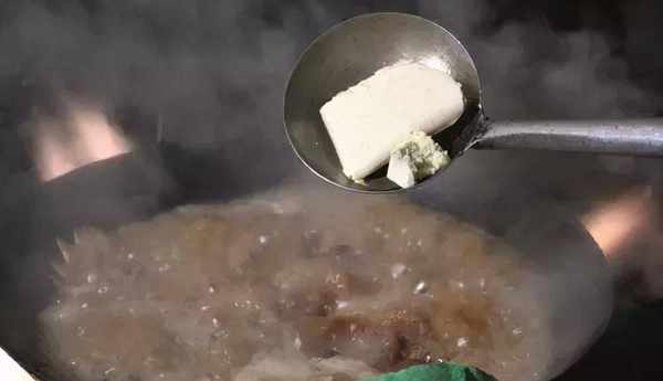 十五秒回鍋料的制作 1.取丁香、桂皮、香葉、桂枝、五味子、肉蔻、白考、酸棗、草果、山柰、白芷、香草、當參、天麻、甘草、陳皮、辛夷、幹薑、百合、枸杞、決明子、當歸各50克分別粉碎,然後用蒙山山泉水煮制20分鐘過濾,水分倒掉,分別烘幹,再分別倒入鋁鍋內,幹煸,然後所有粉料混合,自然風幹24小時左右。2.鍋內放入老母雞油,下入粉碎後的香料粉炒香即可。