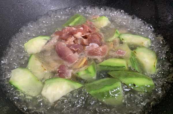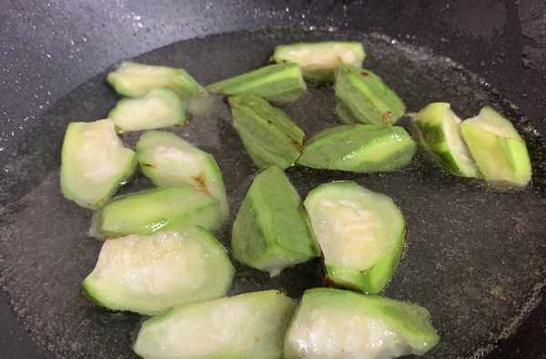 第三步:鍋裡加入少許花生油,油溫燒至七成熱後把絲瓜滾刀塊兒放進去,翻炒片刻至軟。接著加入適量的清水大火燒開。