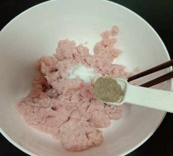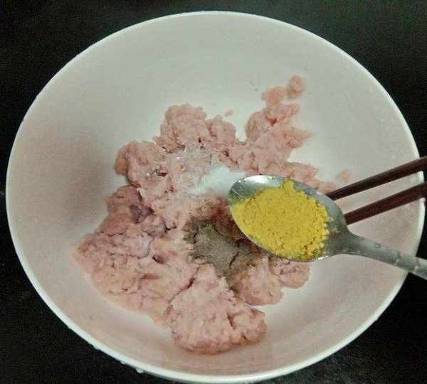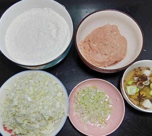 第1步、食材:面粉、豬肉餡、包菜大蔥切碎、大蔥薑片花椒八角桂皮用溫水浸泡。