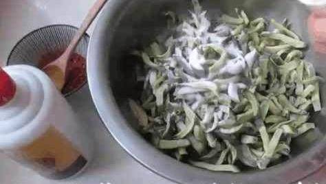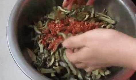 曬幹後將蘿卜放入清水中清洗幹凈,然後瀝幹水分倒入盆中,加入適量的鹽,醬油,白酒,辣椒面,花椒面。手帶上一次性手套,將蘿卜幹和調料抓勻。抓勻後,準備一個密封瓶,然後將攪拌均勻的蘿卜裝入瓶中,保存一個星期即可使用。美味的蘿卜幹就做好瞭。