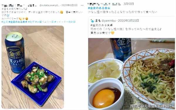 金麥沒有自己的官方twitter,它有點像我們身邊那些網感一般,但在大型商超和夫妻老婆店總能看見的品牌。不過它也有在twitter上投放過一個詞條。這個名為#金麥のある食卓(有金麥的餐桌)的詞條最早在2020年出現,直到現在還有用戶自發發送內容。