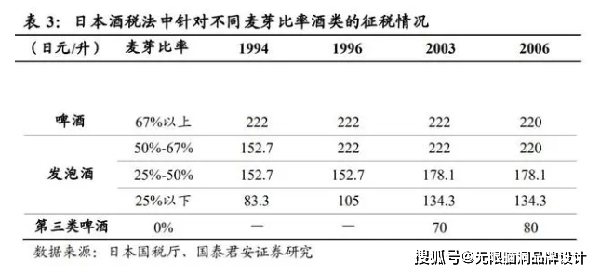 1994年,日本啤酒稅收新政按麥芽度劃分稅率高低,三得利就研發瞭麥芽含量低於 67%的發泡酒並率先推向市場。發泡酒稅率上調後,三得利再次進行針對性的研發,推出更低麥芽度的 第三類啤酒產品。[1]