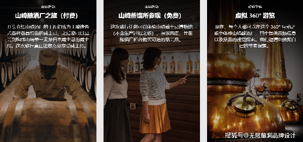 消費者有三種方式可以瞭解山崎的歷史和制造工藝,分別是線下付費參觀釀酒廠、免費參觀蒸餾所,和線上360°互動遊覽。