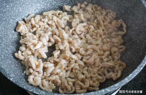 起鍋熱油,下入板筋絲,用筷子迅速劃散至變色後盛出。