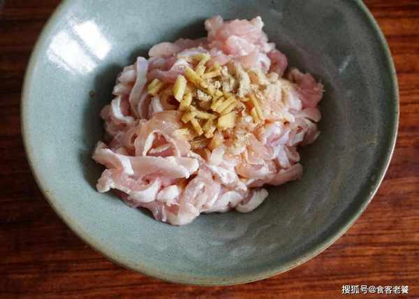 選用新鮮豬板筋洗凈晾幹水分,先將板筋切成絲放入碗中,取薑絲、生抽、白胡椒粉和啤酒抓捏均勻醃制片刻。再放入淀粉、食用油抓捏均勻,放在一旁備用。