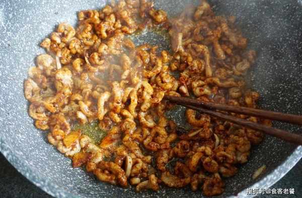 鍋裡留底油,下入蒜片和蠶豆醬爆香,再將豬板筋放入翻炒均勻。