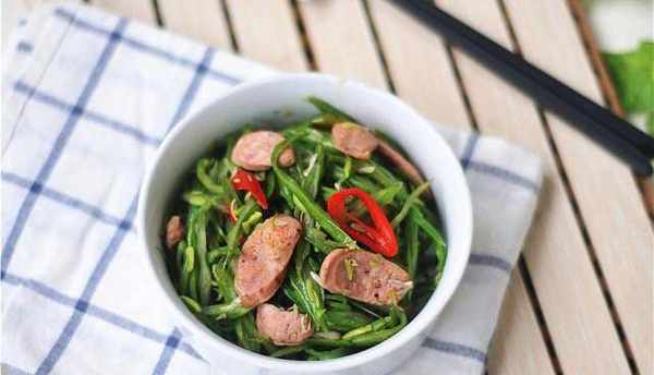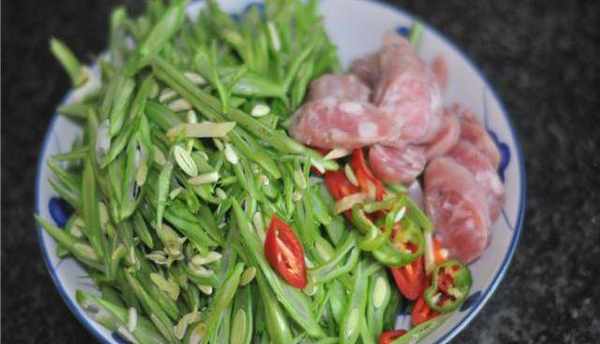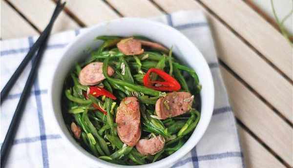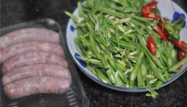 食材:四季豆200克 青紅椒幾個 鹽一撮 油一勺 肉腸幾根