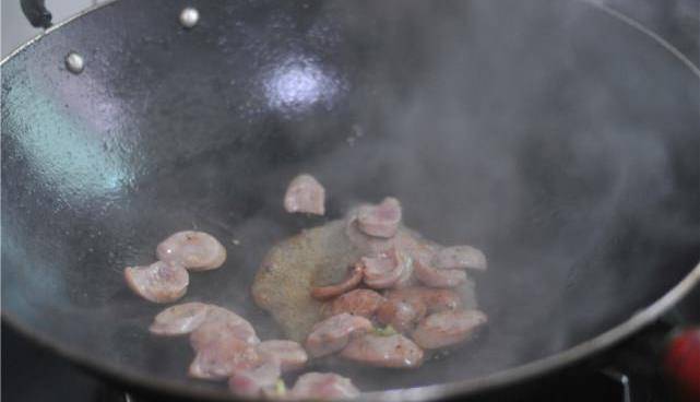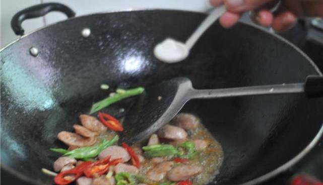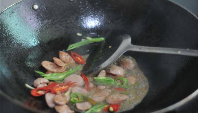 油鍋燒熱,放入香腸,炒至微微變色