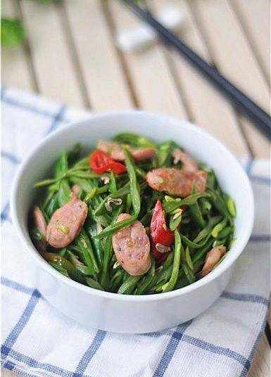 擔心香腸不熟,j炒制的時候加瞭少許水燒制,其實直接炒也是可以炒熟的哈。