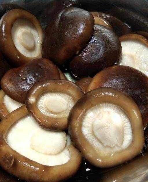 2.香菇去掉根部,清水加入淀粉浸泡5分鐘,再清洗幾次,放入沸水裡焯熟,撈出放入涼水裡,沖洗幹凈攥幹水分備用