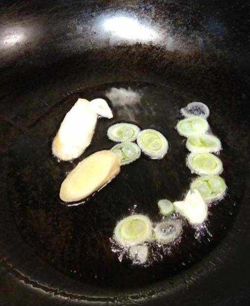 3.準備蔥花薑片蒜片、香菇斜著切片備用,然後熱鍋燒油,放入蔥花,薑片,少許蒜片,煸出香味,放入十三香