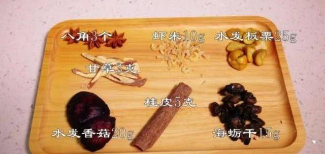 輔料:板栗25g,香菇若20g,幹蝦仁10g、海蠣幹15g、八角3個,桂皮5g,幹草3g、八角3個;