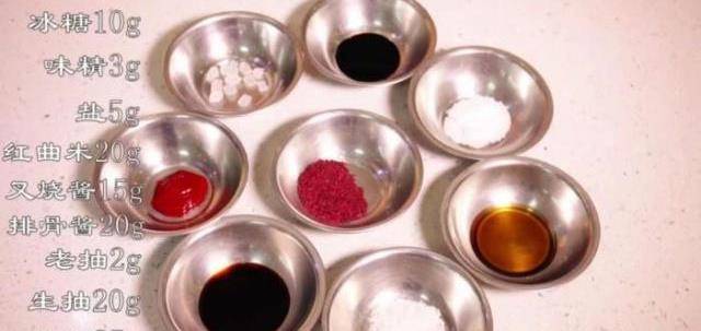 調味品:生抽20g,老抽2g,(老抽為上色,少一點。)老抽,鹽5g,味精3g,冰糖3g,紅曲米20g,叉燒醬15g,料酒25g;