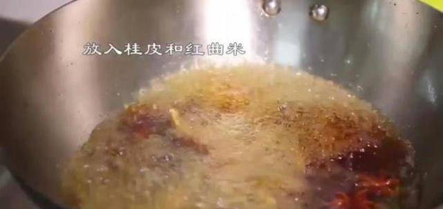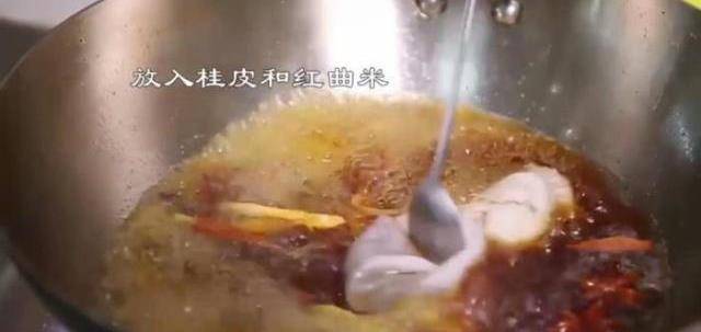 4、放入水、桂皮、紅曲米;