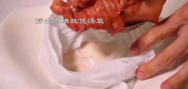 6豬肉撈出,放入煲湯紗佈袋,或者紗佈巾都可以;