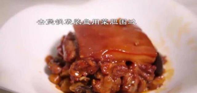 9、同安封肉出鍋,去紗佈袋,裝盤,皮放在最上面,也就是倒扣;