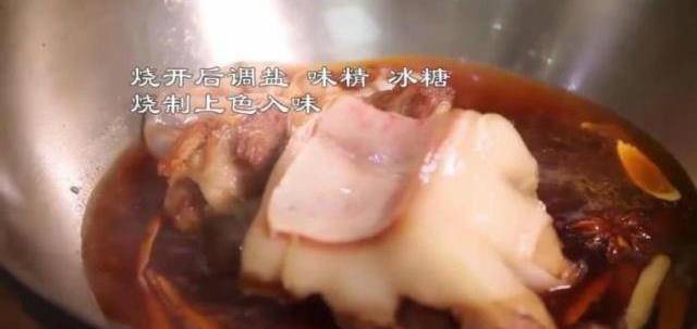 5水開後放入豬肉,加入調味,給豬肉上色;