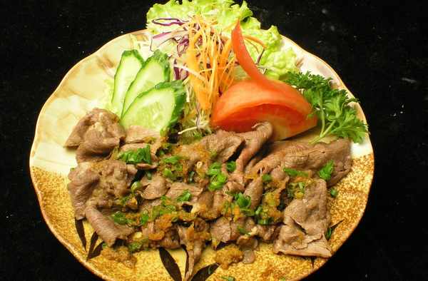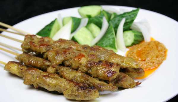 主料:牛肉約2磅;輔料:蘇打粉1茶勺、沙茶醬2茶勺、水2茶勺。把牛肉串在燒烤串上,竹簽也可以,不過竹簽在使用前要泡水半小時,以防燒烤時燃燒。BBQ開中火,鋪上牛肉串,烤1分半鐘,抹少許沙嗲醬後翻面,再烤1分半鐘,完成