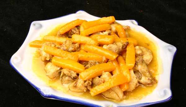 主料:雞胸脯肉150克、南瓜50克;輔料:植物油3湯匙、蔥10克、食鹽4克、薑10克、料酒1湯匙、蒜2瓣、胡椒粉1茶匙、淀粉1湯匙。雞的肉質細嫩,滋味鮮美,適合多種烹調方法,並富有營養,有滋補養身的作用。
