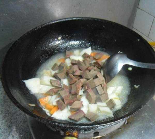 原料:鹵肝、蓮藕、胡蘿卜、蔥、薑、油、鹽、白糖。