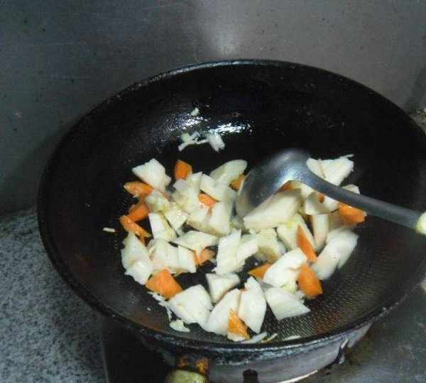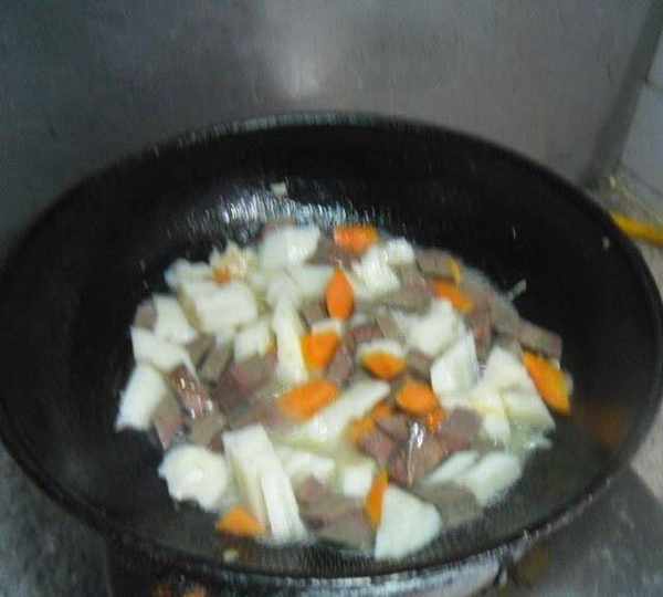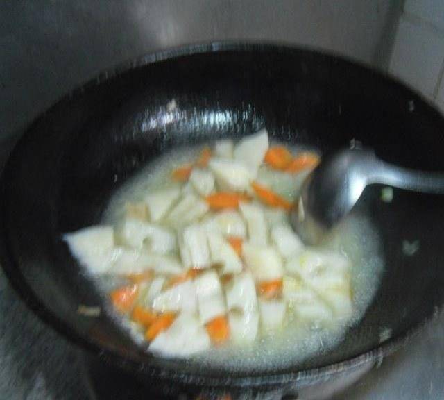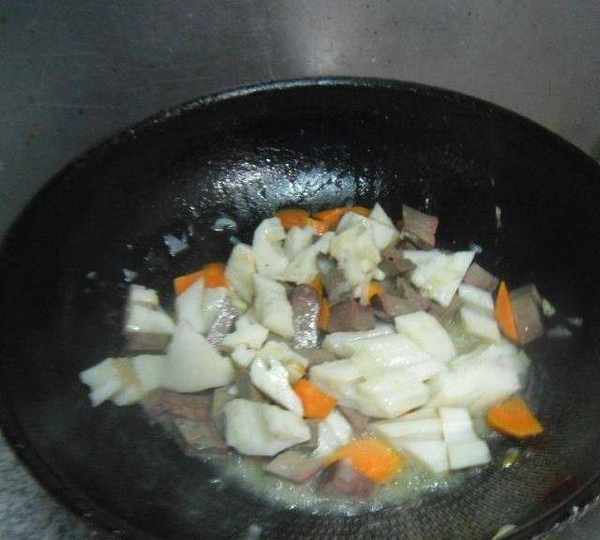 第5步、放入蓮藕、胡蘿卜翻炒均勻。