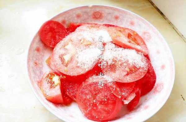 1.食材準備:西紅柿洗凈切成薄片,擺放在盤中,準備適量的白糖。