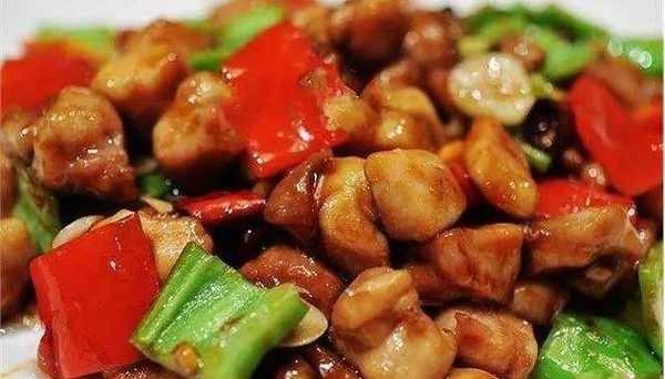 8.放入醃制好的雞肉和大杏仁,快速翻炒;9.雞肉變色後,加入剩餘的辣椒醬;