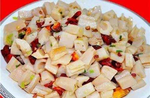 藕切丁,用水洗一下待用,油少量,八成熱下丁,中火翻炒約一分鐘,掰入幹辣椒兩個,鹽少量,糖加不加都可以,少放一點。味精兩粒。出鍋。