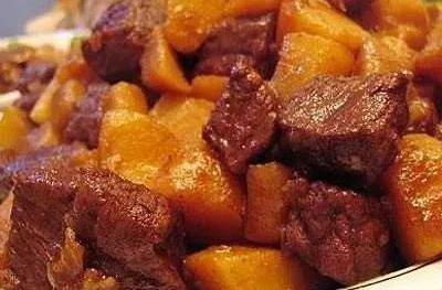 牛肉切塊,和蔥段一起下入涼水鍋中,焯水,煮兩分鐘後撈出來沖幹凈,瀝幹備用。土豆胡蘿卜切滾刀塊,洋蔥切片,蔥、薑切絲。鍋內倒適量油,油熱後下入薑,蔥絲,八角,幹紅椒段爆香。加入牛肉,翻炒5分鐘左右加入適量清水,大火燒開後轉小火燉一個小時