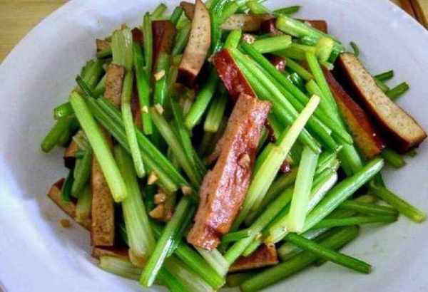 香幹炒芹菜:1.將芹菜去掉葉子,洗凈後順長劃開,切成一寸左右的段2.香幹切成條,幹辣椒斜切成段,大蒜去皮切片,生薑切絲3.熱鍋涼油,放入香幹漸漸煸炒至香4.放入薑絲、蒜片幹辣椒煸一下,放入芹菜翻炒5.烹入生抽,加一點熱水,芹菜炒斷生後放鹽,翻炒出鍋