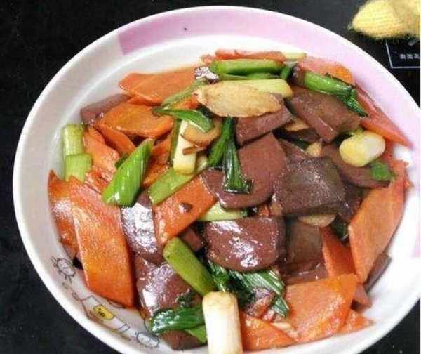 青蒜胡蘿卜炒鴨血:1.鴨血稍微沖洗一下,切成條備用;青蒜斜切成條,胡蘿卜去皮切斜片備用;2.鴨血焯水瀝幹水分;鍋內放油,燒熱後放入蒜片和薑片爆香;緊接著放入胡蘿卜翻炒;3.放入青蒜同炒,接著放入焯好的鴨血條一起翻炒,同時放入醬油和生抽;4.出鍋前放入適量鹽翻炒幾下即可;