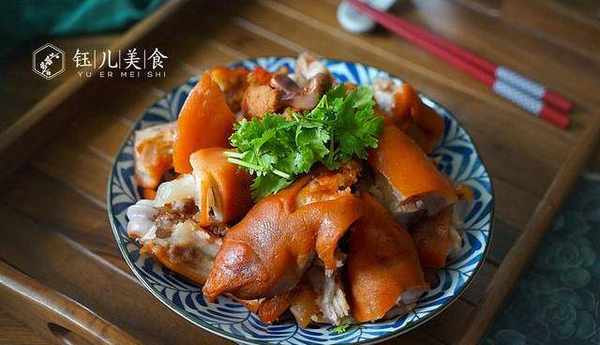食材:前腳豬蹄2個、八角桂皮香葉等大料包一份、紅棗4顆、鹽適量、白糖2小勺、生抽1大勺、老抽2小勺、生薑5片