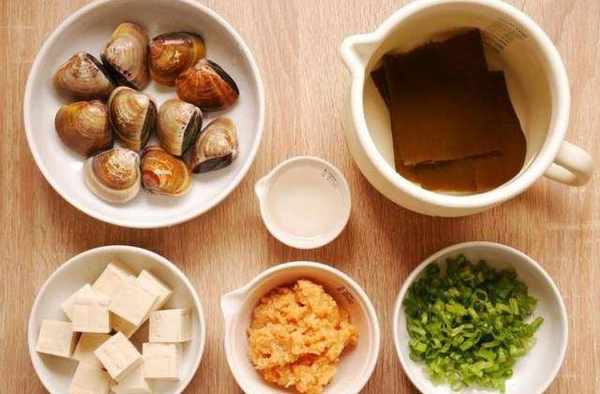 蛤蜊250g、豆腐150g、清酒2大匙、味噌醬100g、蔥花適量。