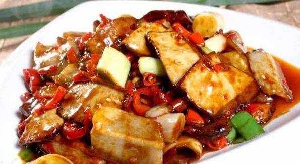 4.鍋中留底油,下入豆豉,炒香,再下入豆腐幹,炒勻,加入半碗清水,蓋上鍋蓋中火燜2分鐘加入一茶匙鹽炒勻;