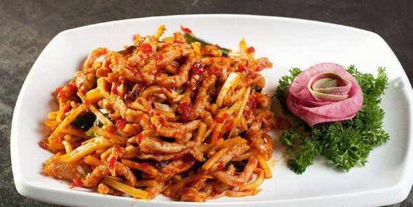 6 將肉絲翻炒均勻。