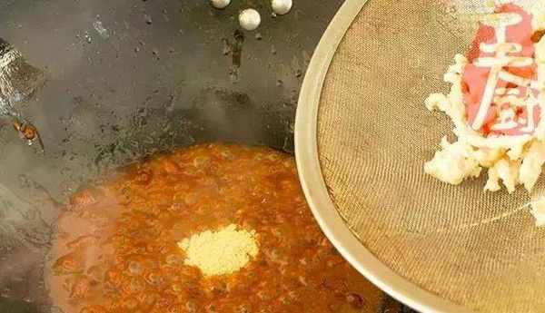 9、炒鍋加少許油燒熱,放入一勺甜面醬,加入少量的水,放入滑好的肉絲炒均勻,盛入盤子裡就可以。