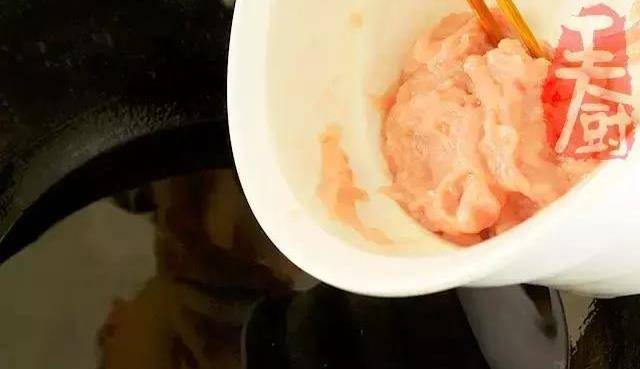 8、肉絲放入油鍋裡滑熟。