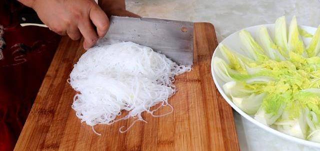下來把提前泡軟的粉絲切的短一點,放在娃娃菜上面