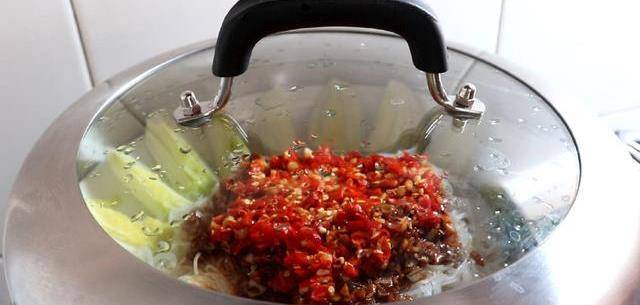 然後在上面再加2勺剁椒醬,一起放在蒸鍋上面蒸,大火蒸5分鐘就可以關火出鍋