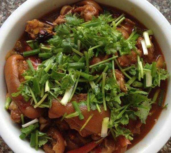 材料:豬腳,薑,胡椒,辣椒,洋蔥,料酒,醬油,糖,鹽,雞精,香油,細香蔥;