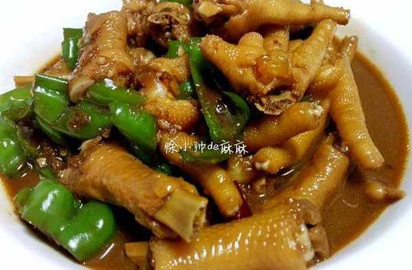 3、熱鍋熱油先將生薑蒜粒幹辣椒爆香,放入雞爪,開始添加作料:生抽、老抽、鹽、糖、醋、料酒翻炒上色。倒入沒過雞爪的熱水,大火煮開,小火燜煮,看到湯汁明顯變少將青椒倒進去翻炒即可。