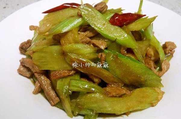 1、芹菜去掉老葉子,洗凈,切小片。鮮肉一點洗凈切絲,幹辣椒兩個。