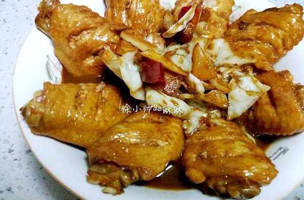 1、雞翅中洗凈,切開;包菜葉一點,用手撕開,洗凈瀝幹水;生薑片、蒜拍扁幾顆、幹辣椒兩個切碎。