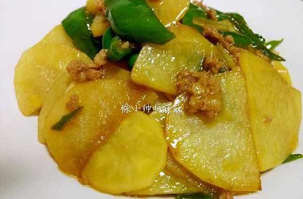 1、食材準備:肉末一點,青椒一個洗凈切粗絲,土豆削皮切塊漂洗幹凈瀝幹水。